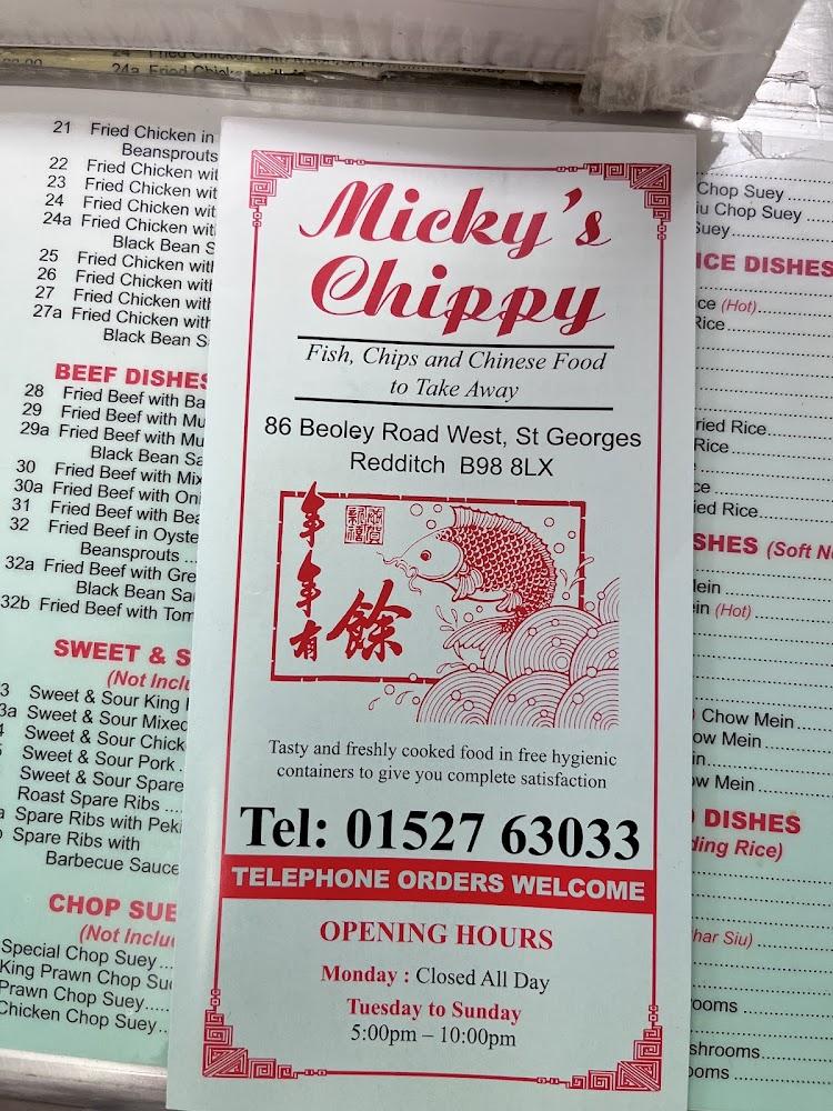 Micky's Chippy stands proudly on Beoley Road West, a bit off the beaten path yet remarkably popular among locals. This hidden gem has served Redditch residents for over 30 years, showcasing its dedication to quality and consistency. The location is easily accessible with wheelchair-friendly entrances and ample parking options, making it a convenient spot for everyone. Situated in a quieter area, Micky's charm lies in its welcoming atmosphere and commitment to culinary excellence. The restaurant thrives in a unique combination of two beloved cuisines: classic British fish and chips and delectable Chinese dishes, catering to diverse palates. Evenings often bring a bustling crowd, especially during dinner hours, where families gather over hearty meals or grab quick bites. It's a place where time-tested recipes meet vibrant flavors, and the community loyalists ensure the lines don't dwindle, solidifying Micky's status as a Redditch staple. With a handful of seating options available, it's perfect for a cozy dinner out or an easy meal to take home.